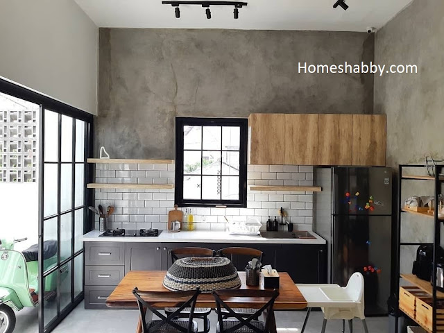 Pecinta desain minimalis dengan sentuhan industrial, gambar dapur kali ini bisa langsung dijadikan inspirasinya. Dinding semen ekspos yang dibiarkan tanpa finishing sangat cantik dengan khas warna abu serta bercak putih. Material yang sederhana lain juga dipilih seperti bahan kayu alami untuk penggunaan kitchen kabinet dan meja makan. Untuk mendapatkan efek industrial yang lebih dominan lagi, anda bisa memilih meja dapur dengan kabinet bawah warna abu-abu dengan finishing doff yang elegan.