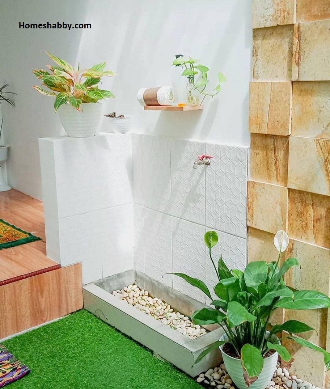 Nuansa hijau dari area ini terlihat cukup menonjol dan tampak menyegarkan. Bagian sudut ruang yang dibuat tempat wudhu dekat laundry room ini memberikan sentuhan yang menarik dengan resapan dari batu koral. Meski hanya dengan ukuran 0.75 x 0.75 m, desain tempat wudhu ini tetap terasa menyegarkan yang dilengkapi tanaman hias lebih manis dan teduh.